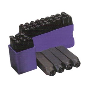 Number and Letter Die Stamp Set. Made from case hardened steel. 3/8'' dies will stamp letters, names, or numbers into metal, wood, Aluminum, etc. The 36 piece die set includes all 26 letters A-Z, plus numbers 0-8, no. 6 is inverted to make no. 9 . Includes a storage case. The font type is Arial. Stamp set measurements are from top to bottom of the letters and numerals.